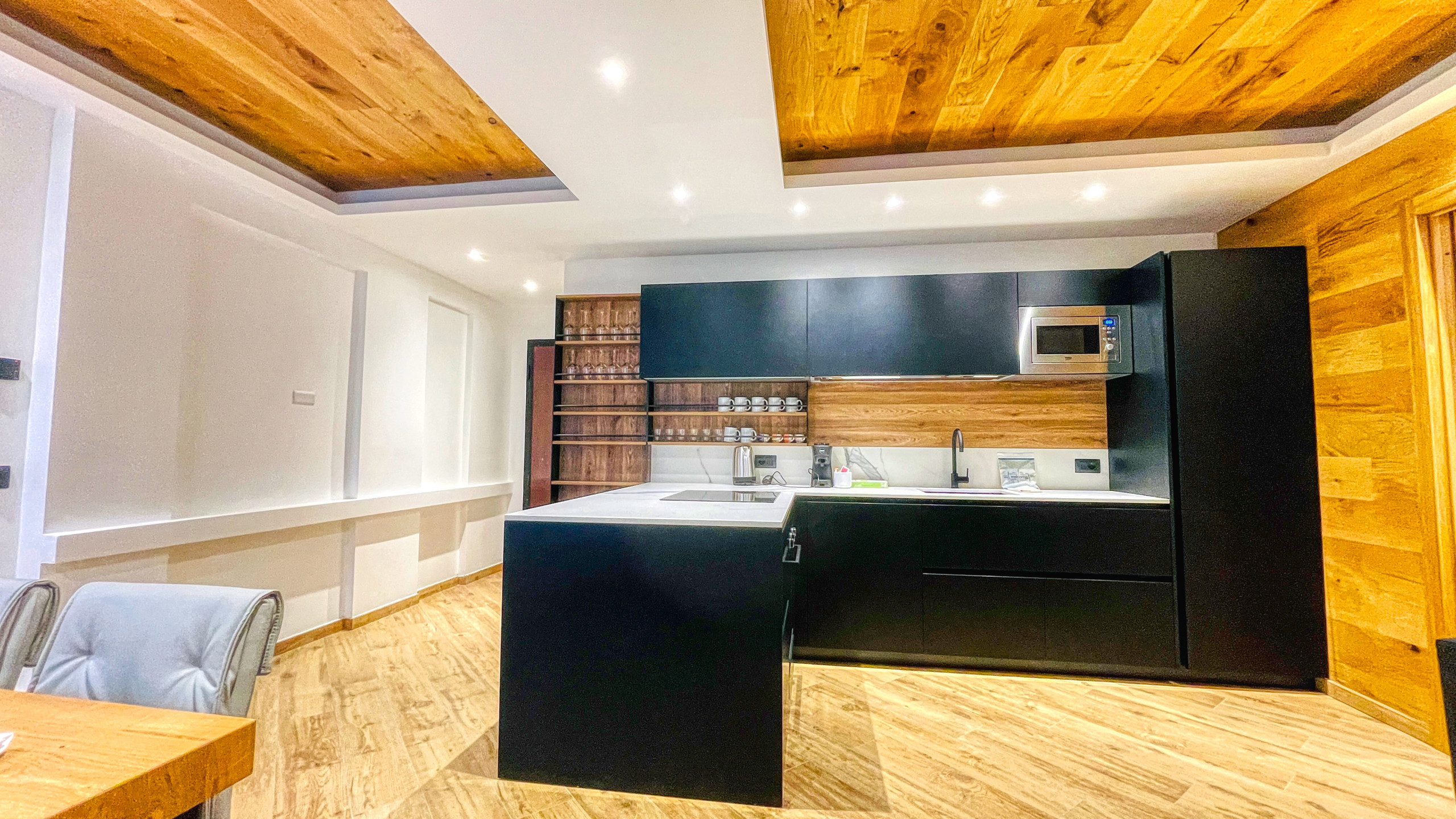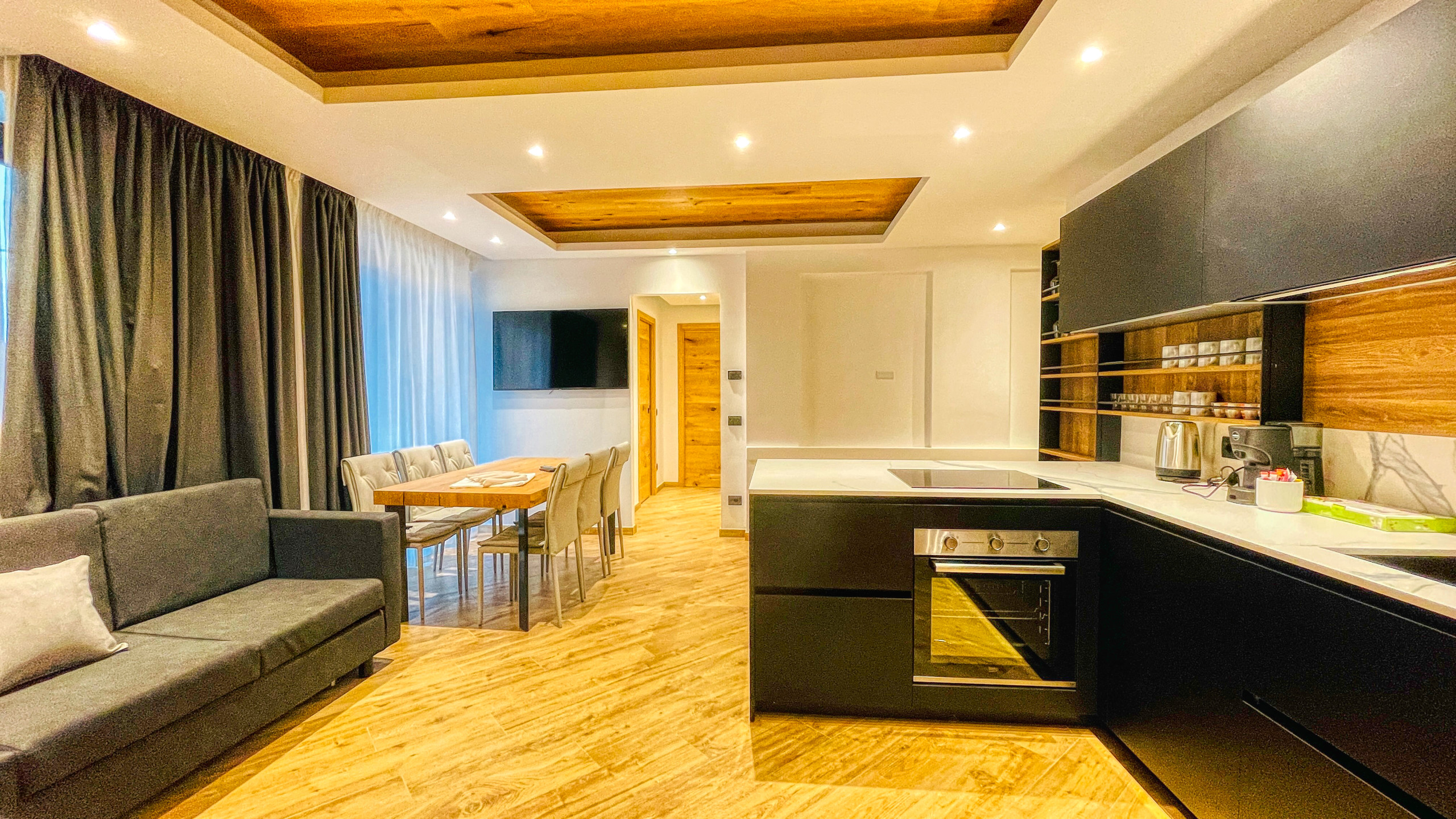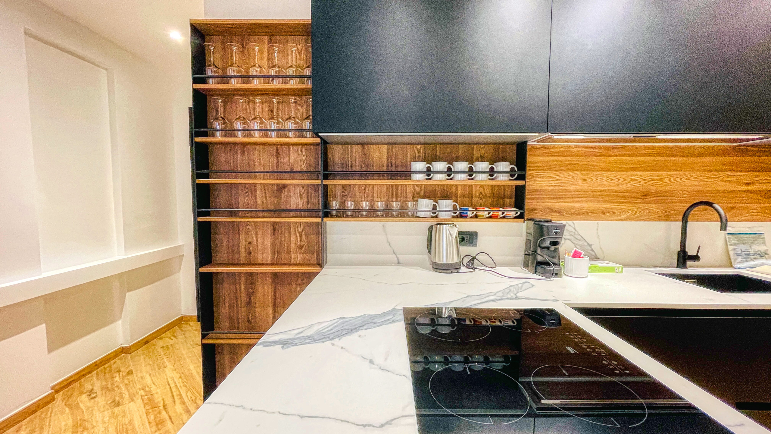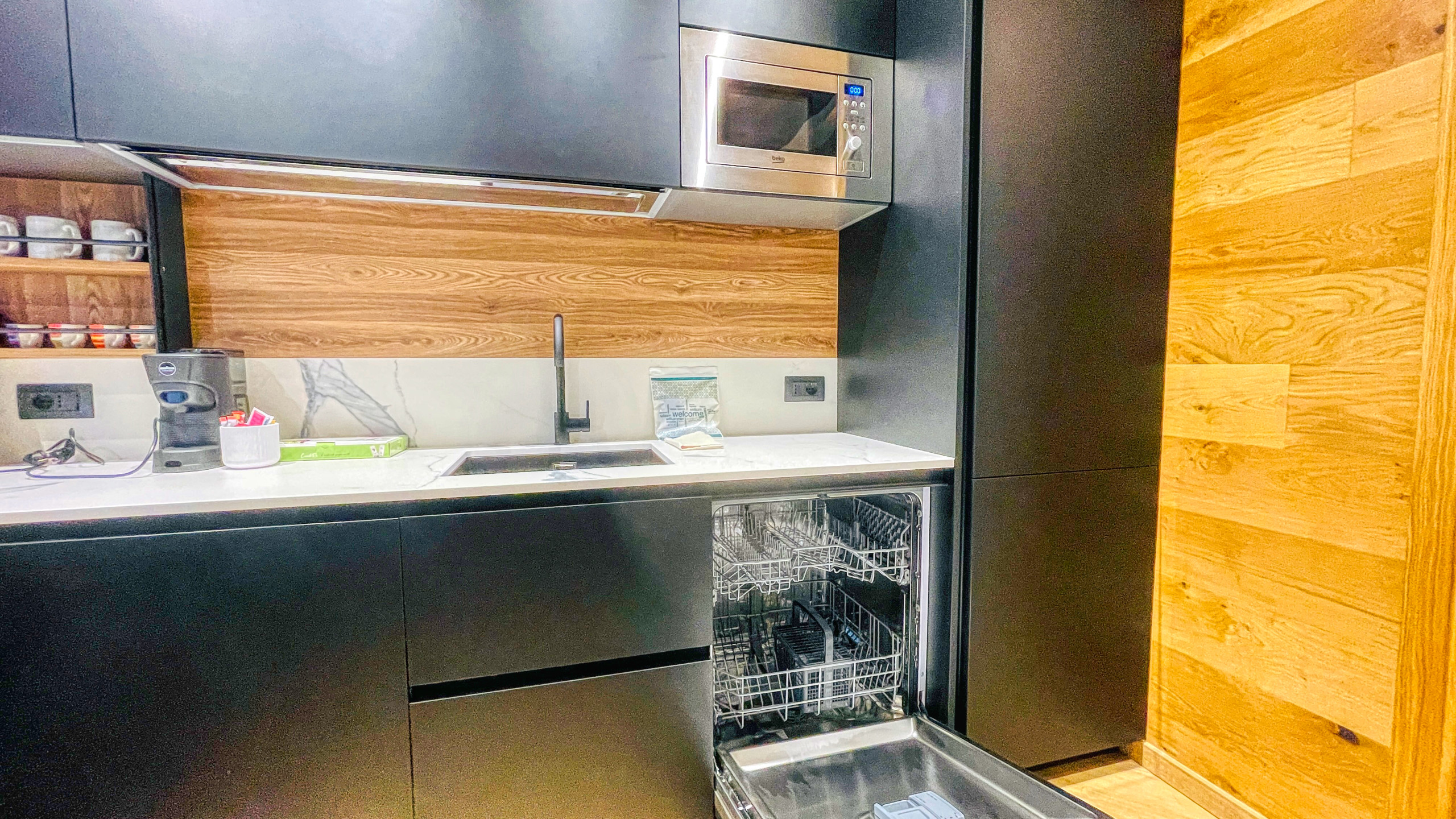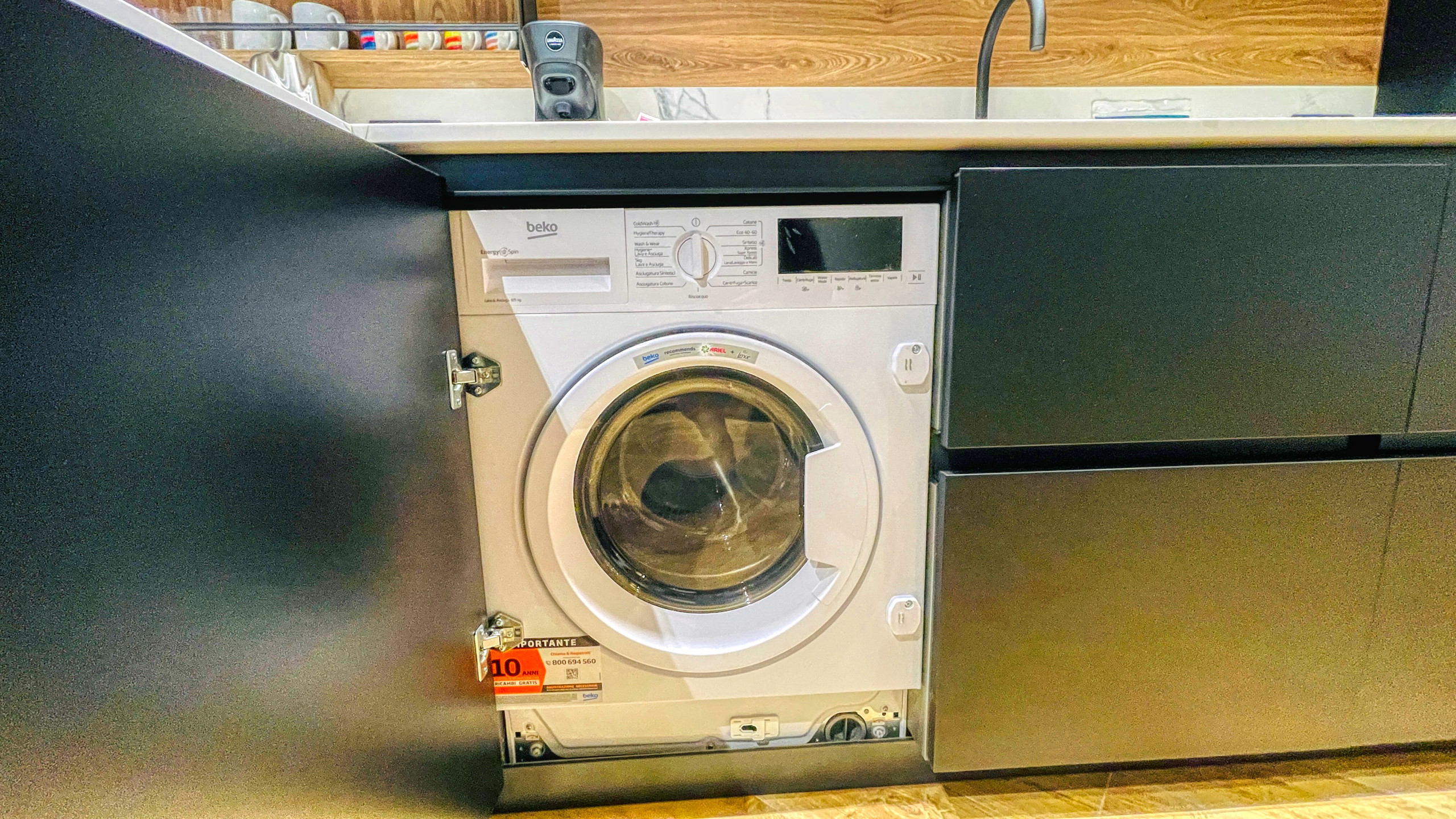 L'appartamento è accessoriato con cucina a induzione, bollitore, macchina del caffè, forno, forno microonde, lavastoviglie, lavatrice/asciugatrice,