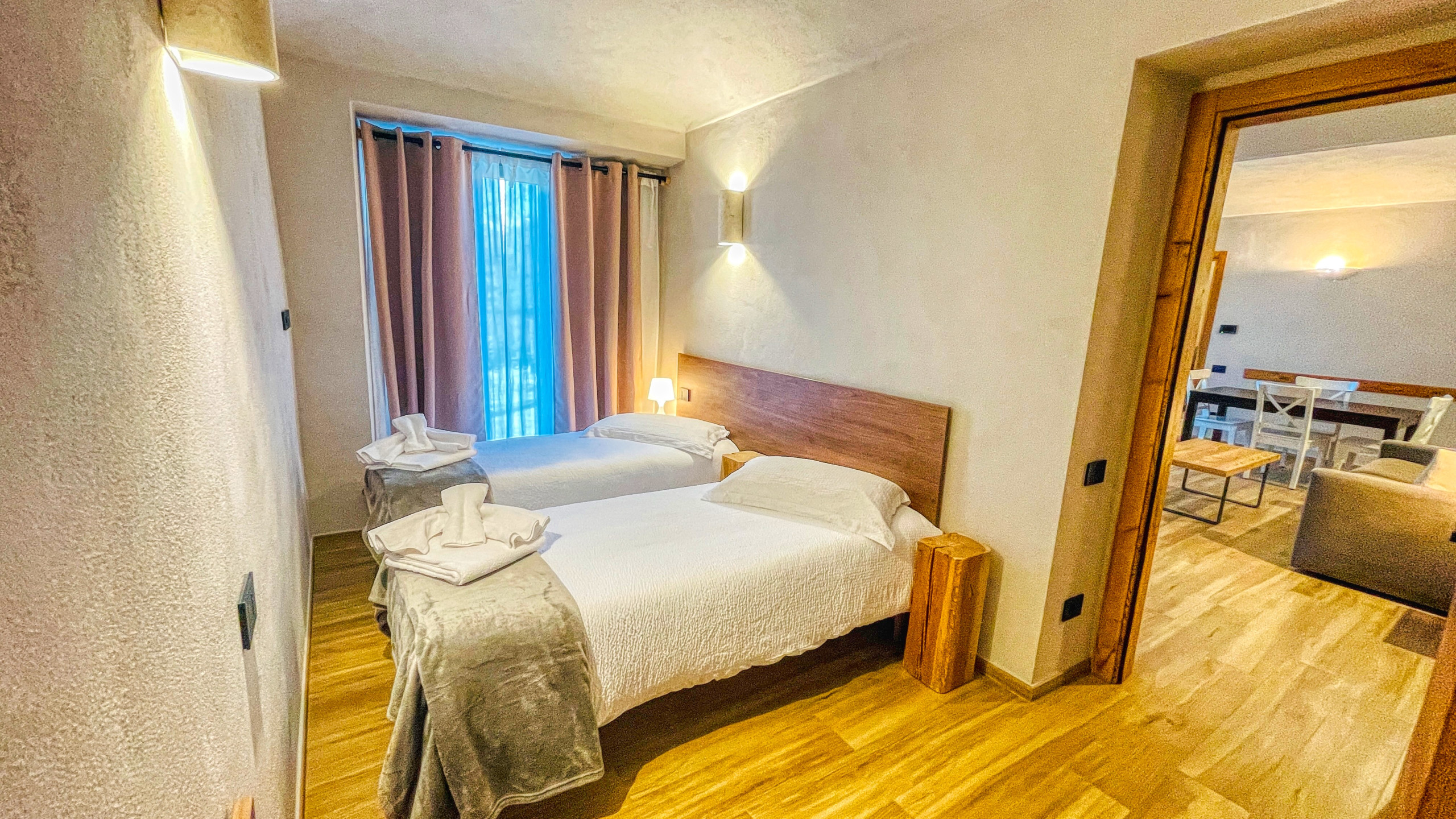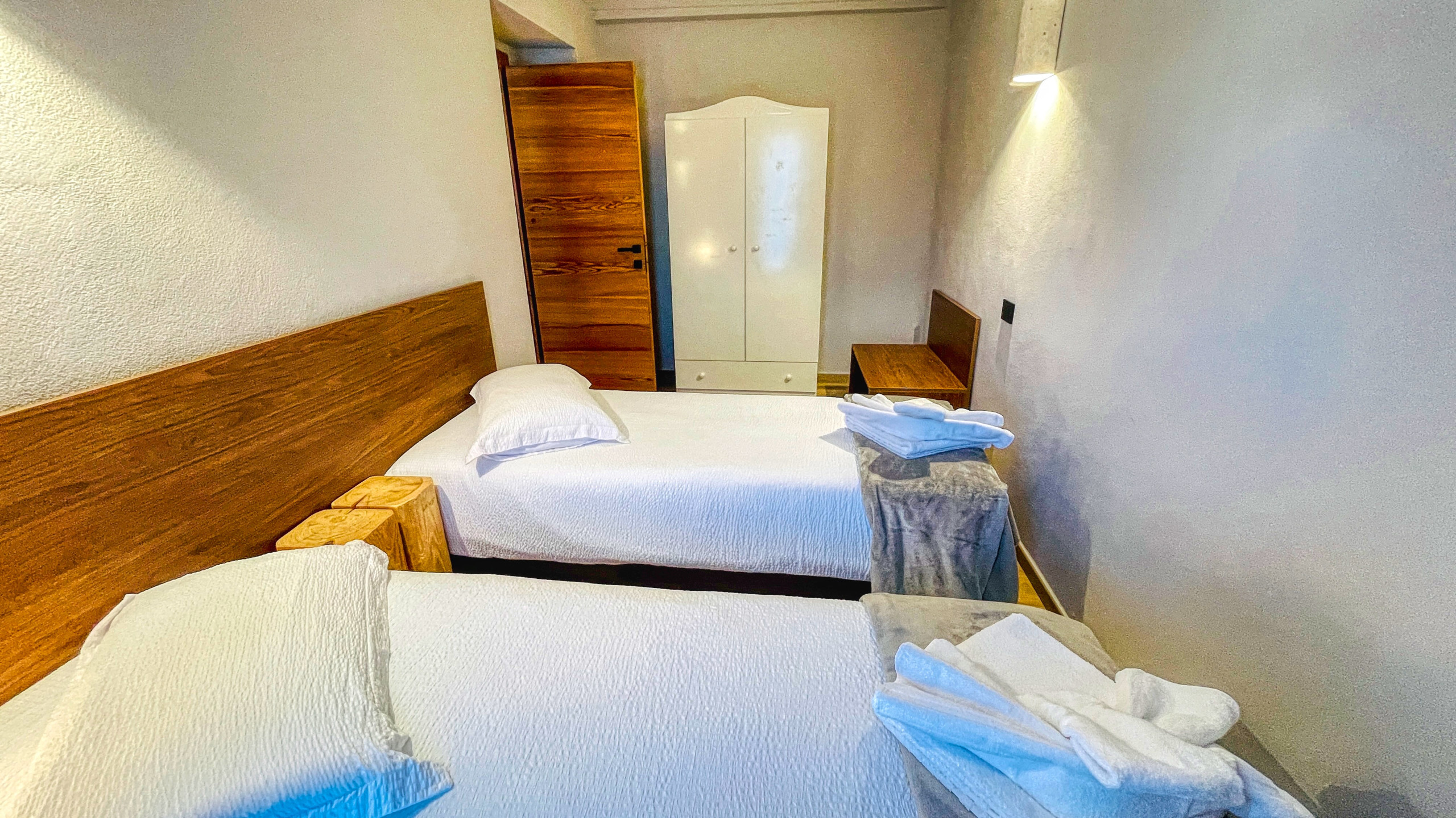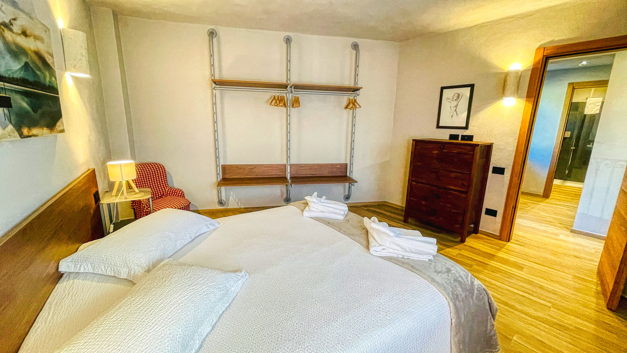 Disimpegno con un posto letto singolo che porta alla camera matrimoniale comunicante con la cameretta singola e al bagno con comoda doccia e lavatrice.