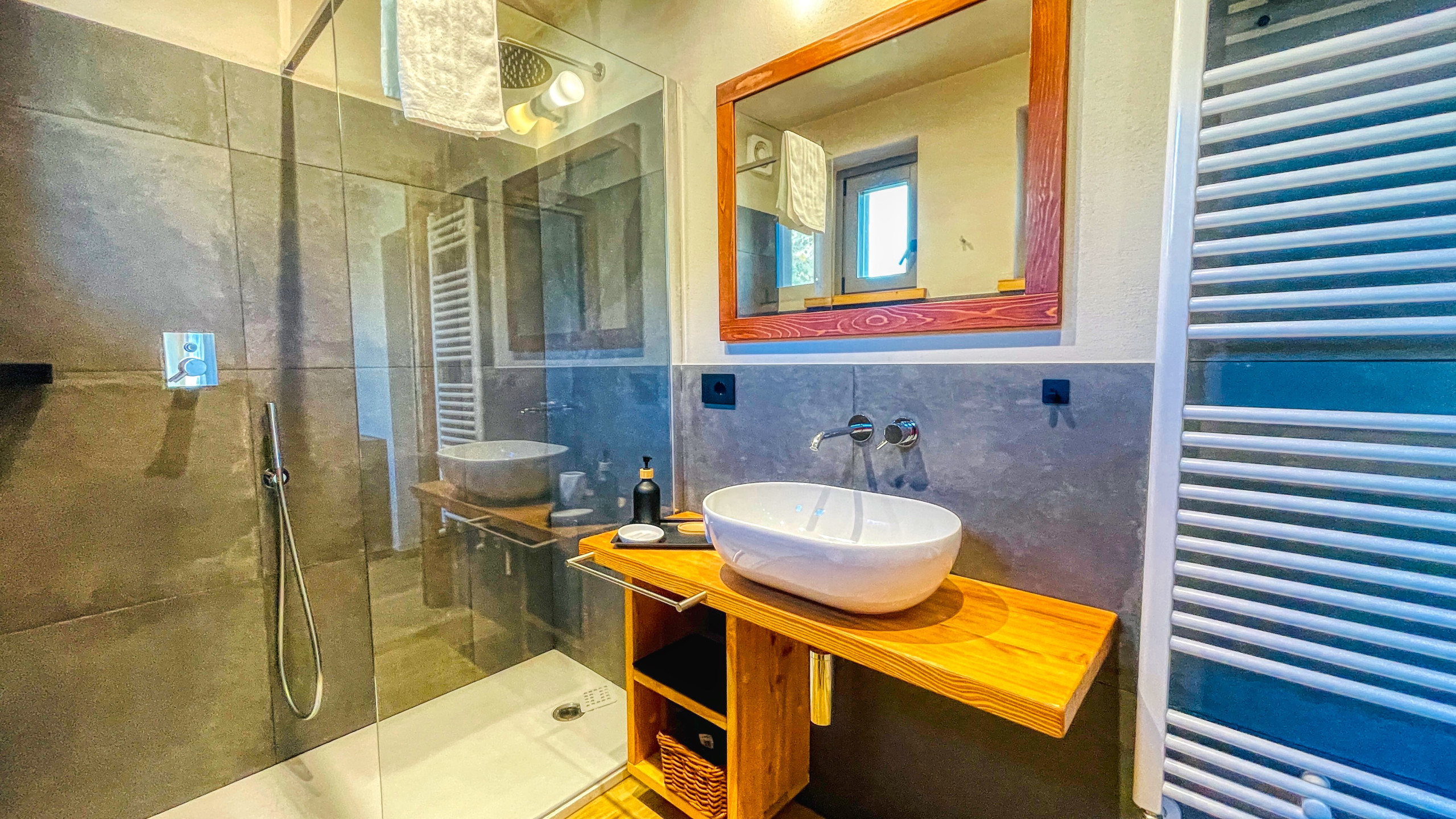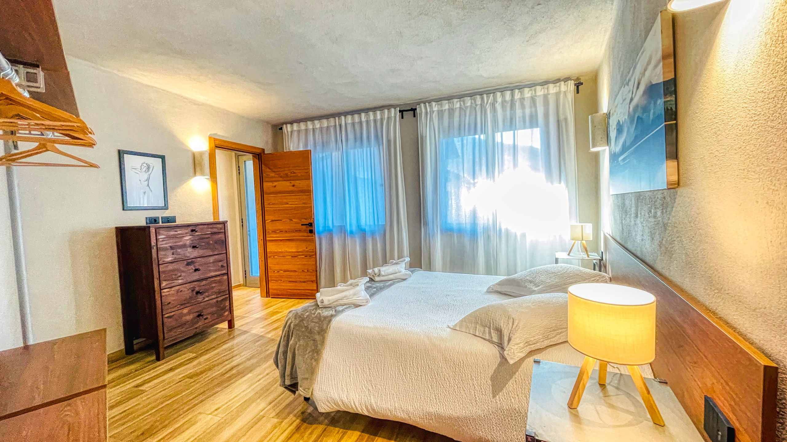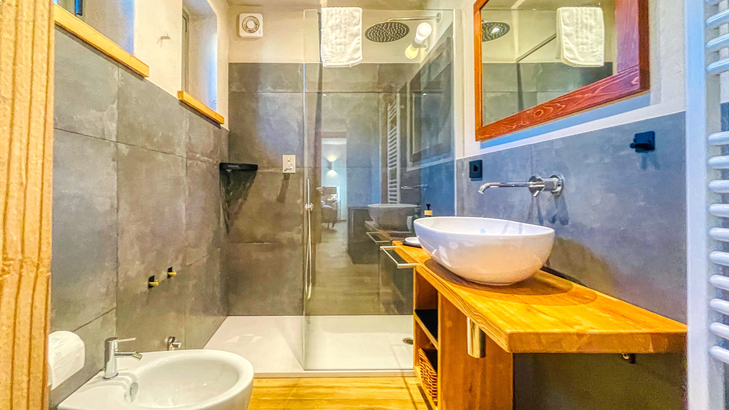 Disimpegno con un posto letto singolo che porta alla camera matrimoniale comunicante con la cameretta singola e al bagno con comoda doccia e lavatrice.
